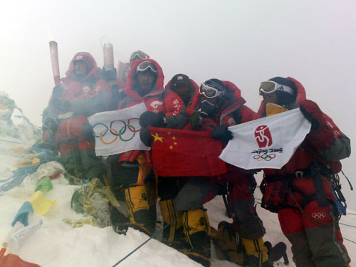 A dozen of climbers celebrated at the 8,844-meter summit, holding the Chinese national flag, the Beijing Olympic flag and the five-ring Olympic flag.
