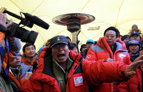 Li Zhixin (C), the commander-in-chief of the Beijing Olympic flame Qomolangma mountaineering team celebrates with other staff after the torch reached the peak on Thursday morning. [Xinhua]