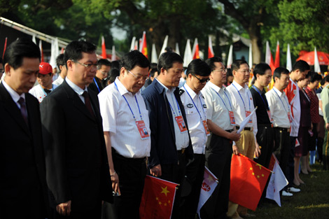 Olympic torch relay organizers, torchbearers and staff members observe one minute of silence in memory of the victims affected by the 7.8-magnitude earthquake in Southwest China's Sichuan Province before the torch relay in Ruijin, East China's Jiangxi Province, May 13, 2008. Organizers of the Beijing Olympic Games said Tuesday that a minute of silence will be observed during future stops of the torch relay to mourn the victims of the earthquake. [Xinhua]
