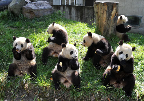 Six giant pandas eat food at their enclosure in Wolong Panda Reserve in quake-stricken Sichuan Province on May 23, a day before leaving for Beijing. [Xinhua]