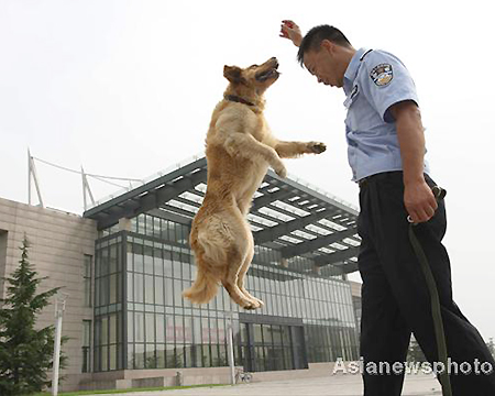 A policeman gets a sniffer dog to jump at a training base in Beijing, July 2, 2008. A total of 204 sniffer dogs and their masters from the country's 20 provinces will be responsible for security in Beijing during the Olympic and Paralympic Games from August. [Asianewsphoto]