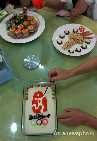 A chef works on his Olympic-themed course in Tianjin, July 2, 2008. More than 100 chefs in Tianjin participated in an Olympic-themed culinary competition. [Asianewsphoto]