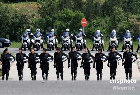 Traffic policewomen who were chosen to lead the vehicles carrying Olympic guests on motorbikes pose for a group photo at their training site. [cnsphoto]