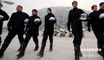 Traffic police who were chosen to lead the vehicles carrying Olympic guests on motorbikes pose in front of the Bird's Nest. [cnsphoto]