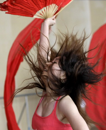 A member of professional cheerleading squad practises during a training session for the 2008 Beijing Olympic Games and Paralympic Games in Dachang County in Hebei province July 4, 2008. About 600 performers will present cheerleading, dances, acrobatics, drum music, lion dance, martial arts, mascots and ethnic performance during the Beijing Olympic Games. [Agencies]