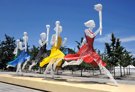 An Olympic sculpture called "Passing the Olympic Flame" stands in the center of the Beijing Olympic Forest Park. More than 80 sculptures have been installed in the park, showing the Olympic spirit of "Higher, Faster and Stronger". [Xinhua]
