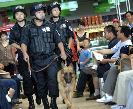 Policemen from the Bengbu Railway Special Police Detachment patrol the waiting hall of Bengbu Railway Station in East China's Anhui Province with a police dog, July 10, 2008. In order to ensure Olympic security, the Bengbu railway policemen are on patrol everyday with police dogs to check for suspicious goods and activities. [Xinhua]