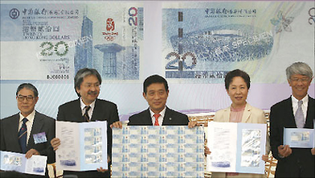 (From left) President of the Sports Federation and Olympic Committee of Hong Kong Timothy Fok, Hong Kong Financial Secretary John Tsang, Bank of China (Hong Kong) Vice Chairman and Chief Executive He Guangbei, Deputy Director of the Liaison Office of the Central Government in Hong Kong Guo Li, and Hong Kong Monetary Authority Chief Executive Joseph Yam attend a ceremony at the Bank of China Tower Friday for the new Hong Kong dollar commemorating the Beijing 2008 Olympic Games. [China Daily]