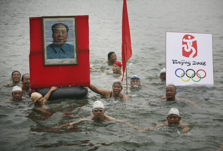 Residents hold a portrait of late Chinese leader Chairman Mao Zedong while swimming in the Yong River in Nanjing, Jiangsu province, July 13, 2008. The swimming activity was held to mark the 42nd anniversary of Mao swimming in the Yangtze River and to welcome the upcoming 2008 Beijing Olympic Games, local media reported. The Chinese characters on the other plate read, "Go to the river, lake and ocean to swim". [Agencies]