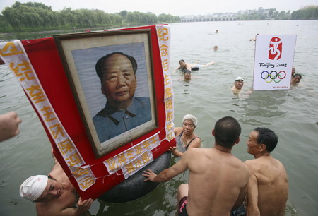 Residents hold a portrait of late Chinese leader Chairman Mao Zedong while swimming in the Yong River in Nanjing, Jiangsu province, July 13, 2008. The swimming activity was held to mark the 42nd anniversary of Mao swimming in the Yangtze River and to welcome the upcoming 2008 Beijing Olympic Games, local media reported. The Chinese characters on the other plate read, "Go to the river, lake and ocean to swim". [Agencies]