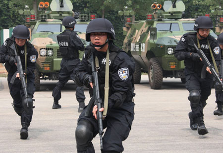 Officers and soldiers who are part of the Qinhuangdao division of the Beijing Olympic Games security take part in a training session to improve their ability to deal with emergencies, July 13, 2008. [Xinhua]