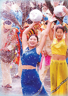 Performers of the Dai ethnic group dance to celebrate their traditional Water-sprinkling Festival. [China Daily]