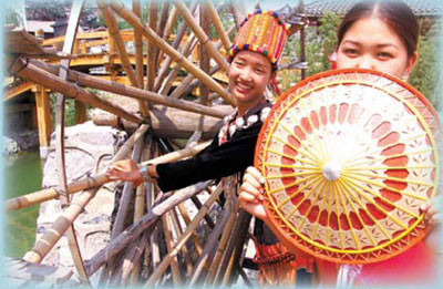 Young women of Jingpo ethnic group demonstrate their traditional lifestyles at the Chinese Ethnic Cultural Park. [China Daily]