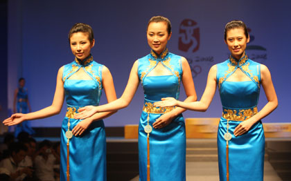 Models wear the outfits of the Olympic victory ceremony hostesses, during the unveiling of the outfits, accessories, and podium of the Olympic medal ceremony at 798 Art Factory in Beijing, July 17, 2008. [Xinhua]