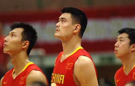 Yi Jianlian (L) ,Yao Ming (C)and Wang Zhizhi (R) stand at the opening ceremony of the game against Angola at the Stankovic Cup Olympic warm-up tournament in Hangzhou, July 19, 2008. [Agencies]