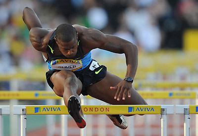 David Oliver of the US wins the men's 110m hurdles during the London Grand Prix athletics event at Crystal Palace in London July 25, 2008. [Agencies]