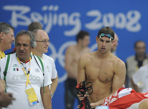 Australia's Eamon Sullivan (R) takes part in a practice session at the National Aquatics Center in preparation for the upcoming 2008 Beijing Olympic Games in Beijing on August 7, 2008. The 2008 Beijing Olympic Games will be held in China from August 8 to 24.Sullivan's ex-girlfriend Stephanie Rice also attended the practice session.[Agencies]