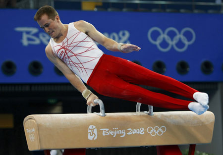 Morgan Hamm of the U.S. practises on the pommel horse during an artistic gymnastics training session at National Indoor Stadium ahead of the Beijing 2008 Olympic Games August 6, 2008. [Agencies]