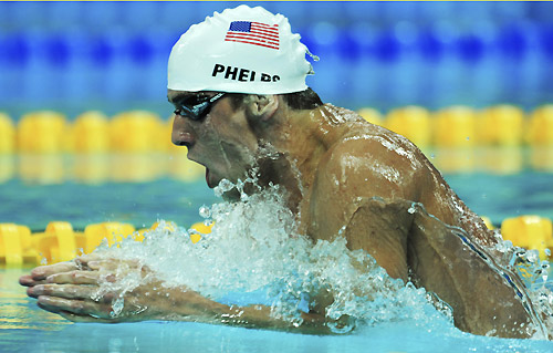 Michael Phelps of the US competes in the heats of the men's 400m individual medley swimming competition at the National Aquatics Center during the Beijing 2008 Olympic Games August 9, 2008. Phelps won the gold in the final. [Agencies]