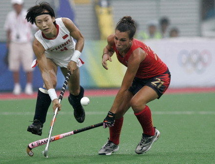 Fu Baorong of China jumps over Spain's Esther Termens' stick during their preliminary hockey match at the Beijing 2008 Olympic Games, August 10, 2008. [Agencies]