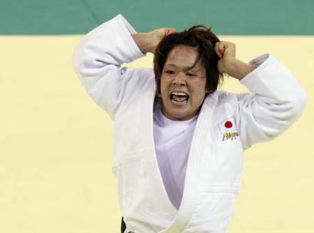 Ayumi Tanimoto of Japan celebrates beating Lucie Decosse of France in the women's -63kg judo final at the Beijing 2008 Olympic Games, August 12, 2008.  [Agencies]