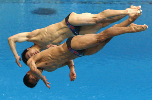 China's Wang Feng and Qin Kai (top) compete during the men's synchronised 3m springboard final at the National Aquatics Center in the 2008 Beijing Olympic Games on August 13, 2008. China's Wang Feng and Qin Kai won ahead of Russia's Dmitry Sautin and Yuriy Kunakov and Ukraine's Ilya Kvasha and Oleksiy Prygorov. [Agencies]