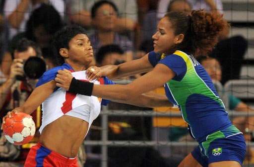 Emiliya Rurney (L) of Russian vies with Alexandra Nascimento of Brazil during a 2008 Olympics Games women's handball match on August 13, 2008, in Beijing. Russia defeated Brazil by 28-19. [AFP]