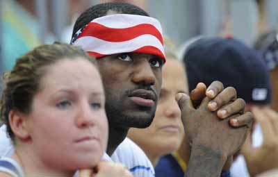 US basketball player LeBron James and other fans watch the swimming finals at the National Aquatics Center during the Beijing 2008 Olympic Games in Beijing on August 13,2008. [Agencies]