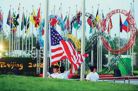 US team takes up residence: The Stars and Stripes is unfurled during a flag-raising ceremony at the Olympic village on August 5 as the US team moves in. [China Daily]