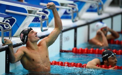 US swimmer Ryan Lochte celebrates winning the men's 200m backstroke final at the National Aquatics Center during the 2008 Beijing Olympic Games in Beijing on August 15, 2008. Lochte broke the men's 200m backstroke world record in winning Olympic gold in 1min 53.94sec. [Agencies]