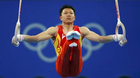Chen Yibing of China competes in the men's rings final during the artistic gymnastics competition at the Beijing 2008 Olympic Games August 18, 2008. [Agencies]