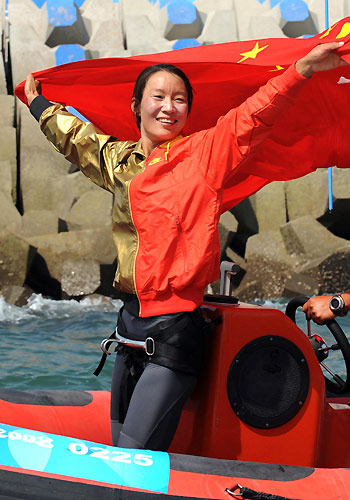 China's Yin Jian celebrates after winning RS:X Women at the Olympic Sailing Regatta in Qingdao on Wednesday. [Xinhua]