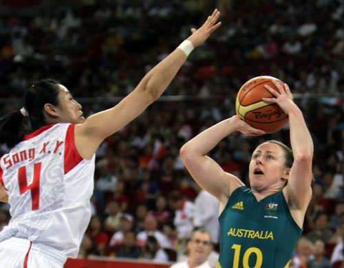China's Song Xiaoyun (L) tries to block Australia's Kristi Harrower during their women's semi-final basketball match China against Australia of the Beijing 2008 Olympic Games on August 21, 2008 at the Olympic Basketball Arena in Beijing.[Agencies]