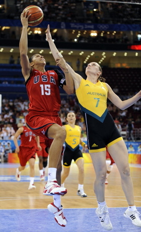 | USA's Candace Parker (L) vies with Australia's Penny Taylor during the women's basketball gold medal match Australia against The US of the Beijing 2008 Olympic Games on August 23, 2008 in Beijing. [Agencies] |