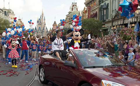 Olympic gold medal swimmer Michael Phelps (C) rides down Main Street USA with Mickey Mouse during a parade at Walt Disney World's Magic Kingdom in Lake Buena Vista, Florida August 29, 2008. [Agencies]