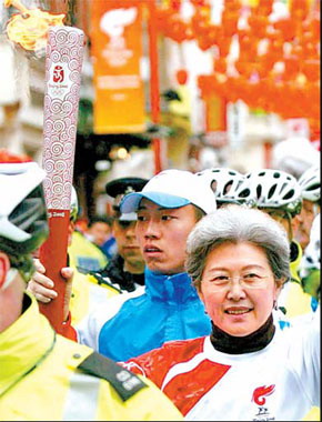 Chinese ambassador Fu Ying runs with the Olympic torch in London on April 6, 2008. [Agencies]