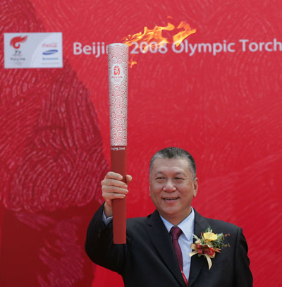 Macao SAR Chief Executive Edmund Ho Hou-Wah holds the Olympic torch at the launching ceremony of the Macao leg of the Torch Relay May 3, 2008. [Xinhua]