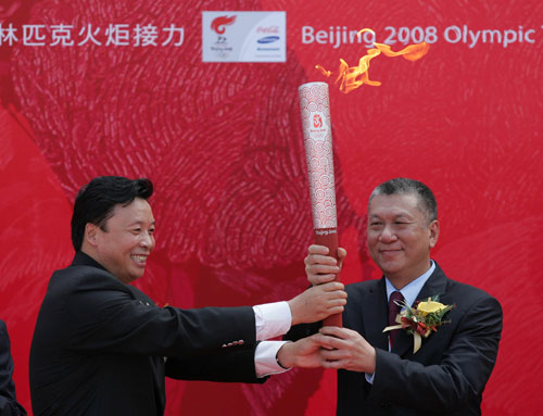 Yang Shu'an (L), Executive Vice President of the Beijing Organizing Committee for the 2008 Olympic Games (BOCOG), passes the Olympic torch to Macao SAR Chief Executive Edmund Ho Hou-Wah at the launching ceremony of the Macao leg of the Torch Relay May 3, 2008. [Xinhua]