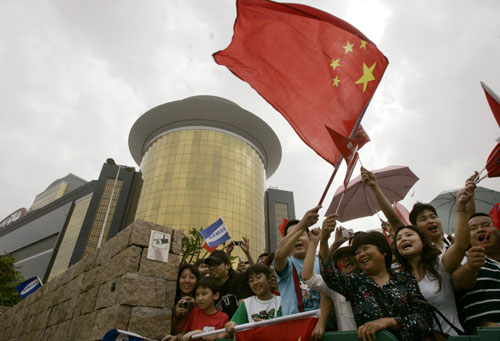 Macao residents and mainland visitors cheer in front of the Sands casino during Olympic torch relay in Macao May 3, 2008. [Agencies]