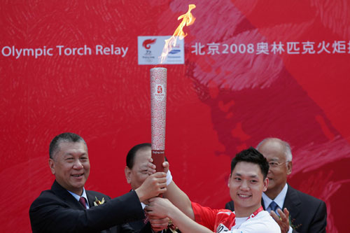 Macao SAR Chief Executive Edmund Ho Hou-Wah (L) passes the Olympic torch to Wushu (martial art) athlete Leong Hong Man, the first bearer of the Macao leg at the launching ceremony of the Macao relay May 3, 2008. [Xinhua]