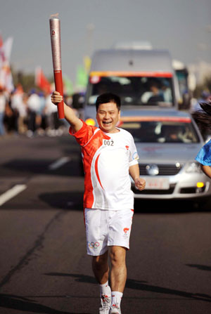 Torchbearer Zhang Zuohong runs with the torch during the 2008 Beijing Olympic Games torch relay in Haikou, south China's Hainan Province, on May 6, 2008. [Xinhua]