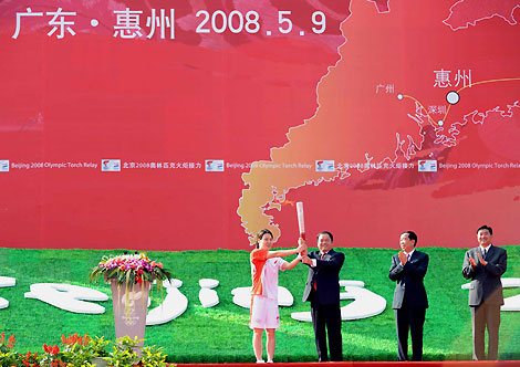 First torchbearer Chen Xiujun (L) receives the Beijing Olympic torch at an opening ceremony during the Beijing Olympic torch relay in Huizhou, Guangdong Province, May 9, 2008. [Xinhua] |