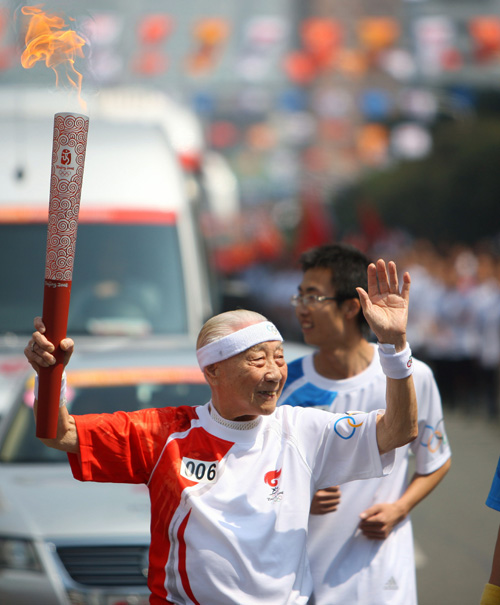 Torchbearer Ou chunkun, 94 years old, runs with the Olympic torch during its relay in Fuzhou, East China's Fujian Province, May 11, 2008. [Xinhua]