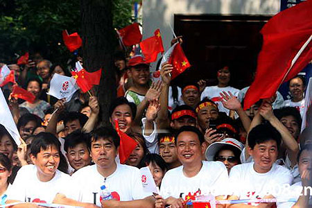 Local people celebrate the Beijing Olympic torch relay in Yueyang. The Olympic torch relay of Yueyang leg kicks off on Tuesday June 3, 2008 in Yueyang, central China's Hunan Province.