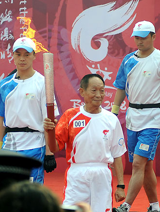 Yuan Longping, the "father of hybrid rice", takes part in the torch relay in Yueyang, Hunan province, June 3. [Xinhua]