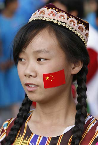 A local resident, wearing traditional Uighur ethnic clothes, has her face painted with a Chinese flag during the Olympic torch relay in Kashgar, Xinjiang Uygur autonomous region, June 18, 2008. The Olympic torch was paraded on Wednesday through China's former Silk Road city of Kashgar. [Agencies]