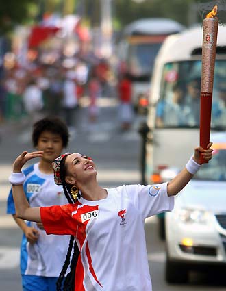 Rena Amudu Kelimu performs a traditional Uygur ethnic dance Tuesday while carrying the Beijing Olympic torch in Urumqi, capital of the Xinjiang Uygur autonomous region. The Olympic flame will pass through northwest China's Qinghai Province from Sunday to Tuesday, covering the International Olympic Day on June 23.[Xinhua]