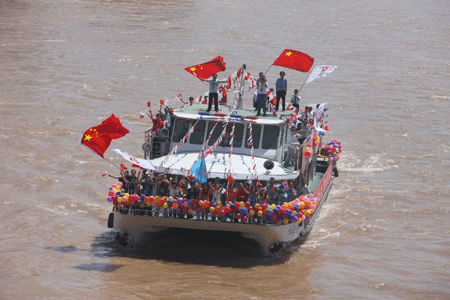 Local people boating on the Yellow river cheer for the Lanzhou leg of the Beijing Olympic torch relay in Northwest China's Gansu Province July 7, 2008. [Xinhua]