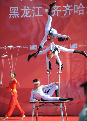 Local acrobats dressed like the red-crown cranes perform during the Beijing Olympic torch relay in Qiqihar, Heilongjiang Province, July 13, 2008. [Xinhua]