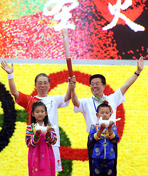 Li Shu (L), the first torchbearer and the first mayor of Songyuan, receives the torch from Lan Jun, general secretary of the Municipal Party Committee, standing in front of a boy and girl holding doves during the Torch Relay in Songyuan, Jilin province, July 15, 2008. [Xinhua]